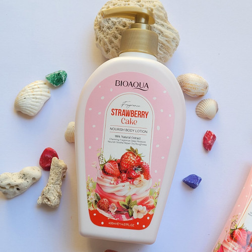 لوسیون بدن کیک توتفرنگی مغذی با 98% عصاره طبیعی بمب احیاء کننده پوست بیواکوا Bioaq