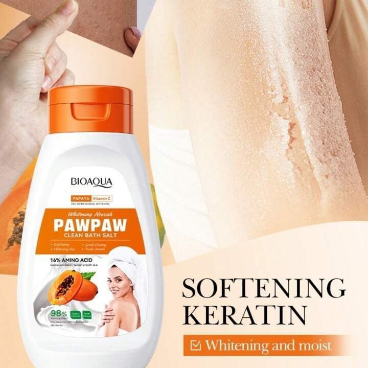 اسکراب ویتامین سی پاپایا ونمک دریا، حاوی آمینو اسید و آنتی اکسیدان های قوی و ویتامین C می باشد که با مصرف آن جریان گرش خون و کلاژن سازی در پوست افزایش می یابد و منجر به جوانسازی و زیبا سازی پوست میشود و تمامی لک ها و تیرگی های صورت و بدن و نقاط حساس بدن را رفع میکند.