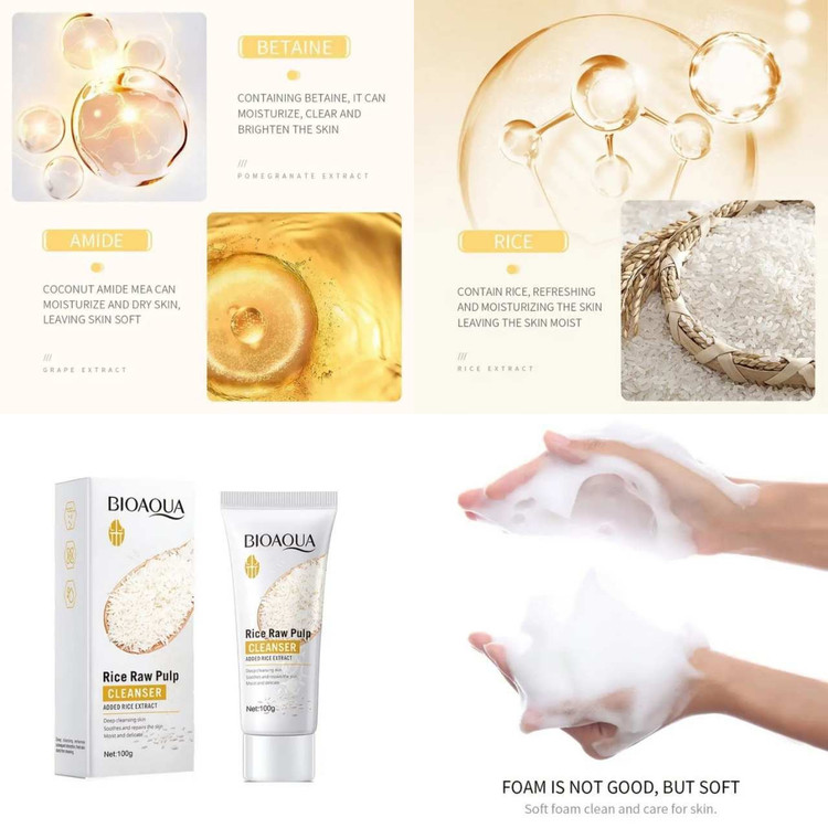 فوم شستشوی صورت برنج دارای اسید آمینه های ضروری برای نگهداری و ساخت و ترمیم بافت پوست میباشد ، همچنین کامل ترین پروتئین ارزش بیولوژیکی برابر ۱۰۰ و فیبرها و کربوهیدرات هاست که خاصیت فوق العاده مفیدی برای پوست دارد، فوم شستشوی برنج تمامی موارد ذکر شده را داراست و باعث پیشگیری از پیری پوست و محافظت از پوست در برابر عوامل محیطی مخرب می شود و به جوانی پوست کمک کرده همچنین التهابات و کدری و تیرگی پوستی را کاملا برطرف میکند و پوست را سفید و شاداب میکند ، از آن مهم تر به کاهش منافذ پوست و شفافیت آن کمک کرده و آبرسانی بسیار عالی دارد به طوری که بعد از شستشو پوست صورت نرم و سفید میشود.