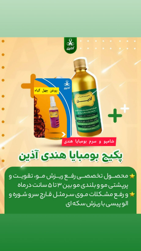 پکیج شامپو بومبایا هندی و روغن چهل گیاه آذین