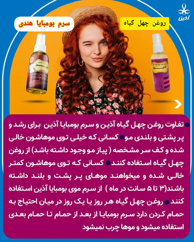 اگر به دنبال محصولی قویتر از روغن کندش هستید به جای سرم بومبایا از روغن چهل گیاه آذین استفاده کنید که ترکیب روغن کندش و روغنهای دیگر برای رویش مجدد و بلندی موها است و مخصوص کسانی است که کف سرشان خالی شده است