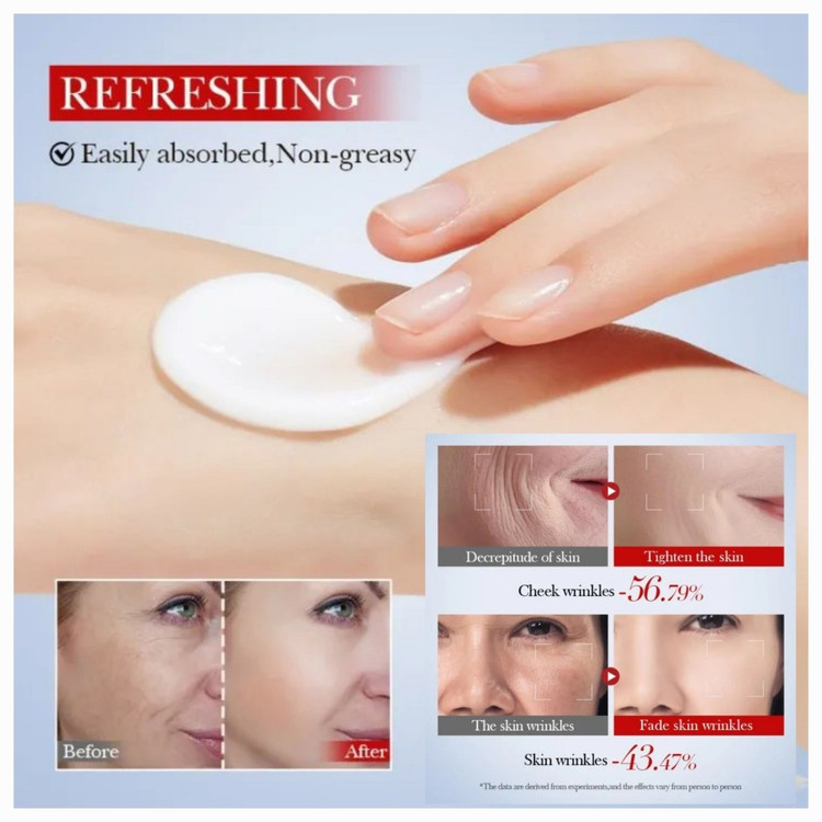این کرم به لایه های پوست نفوذ کرده و خطوط ریز پیشانی و خط لبخند را محو میکند و قدرت شگفت انگیزی در ترمیم کردن و کاهش التهابات پوستی دارد و میتواند پوست شما را فوق العاده شاداب و کشسان و روشن کرده و افتادگی پوست شما را از بین ببرد، همچنین آسیب ها و ناهمواری های سطح پوست را محو میکند و قدرت فوق العاده ای در رطوبت رسانی و افزایش درخشندگی و زیبایی پوست دارد.