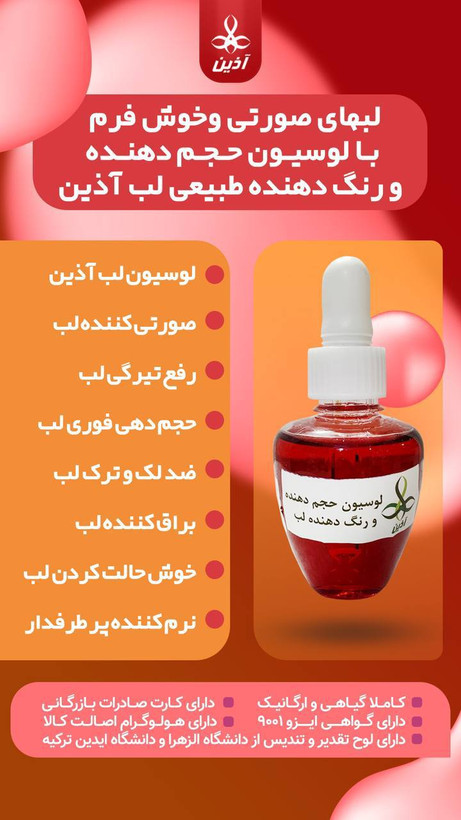 لبهای صورتی وخوش فرم با لوسیون حجم دهنده و رنگ دهنده طبیعی لب آذین👄